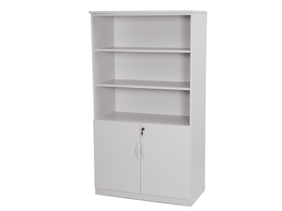 Estrutura em MDF 18 mm melamina. Fundo em MDF melamina 15mm. Aberto na parte superior, com duas prateleiras. Parte inferior com duas portas e fechadura. Sapatas metálicas reguláveis. Disponível nas cores: cinza, bege, branco e amadeirado.
