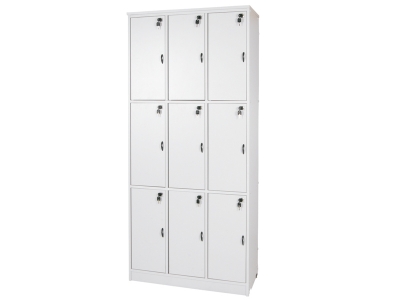 Estrutura em MDF 18mm melamina. Fundo em MDF 15mm melamina. 9 portas com fechaduras individuais. Sapatas reguláveis. Disponível nas cores: cinza, bege, branco e amadeirado.