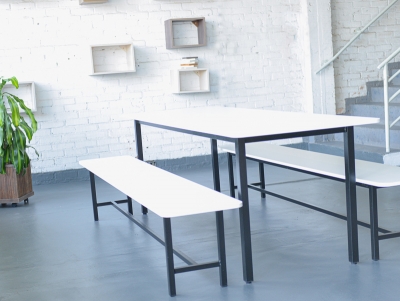 Mesa e bancos para refeitório. Estrutura em aço com pintura epoxi, tampos em MDF 18 mm, cantos arredondados. Disponível nas cores: cinza, bege, branco e amadeirado.